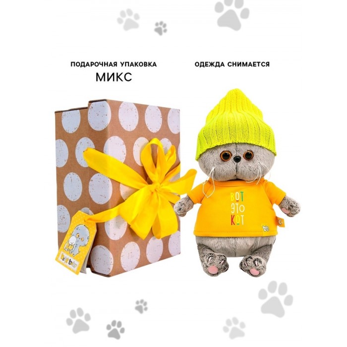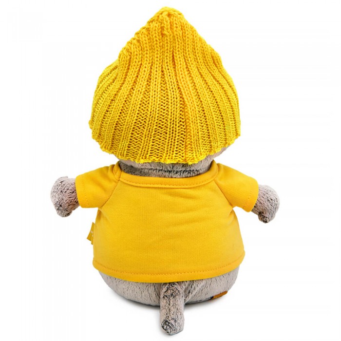 Малыш Басик в крутом комплекте. На котёнке золотисто-жёлтая футболка из плотного х/б трикотажа с фирменным принтом «Вот это кот», а на голове вязаная шапочка лимонно-жёлтого цвета.